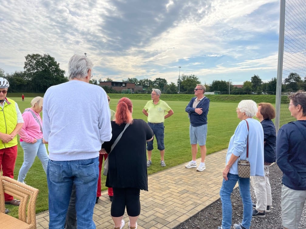 Bei herrlichem Spätsommerwetter ging es auch in diesem Jahr wieder auf die SPD-Erkundungsradtour durch Adendorf. Nach der Begrüßung durch die Stellv. Ortsvereinsvorsitzende Denny Zlotos auf dem Rathausplatz wurde das Gelände des TSV Adendorf angesteuert.